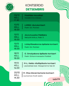 19. detsembril algusega kell 16:00 toimub Laulasmaa kooli muusikaklassis õpetaja Mari-Liis Keldo viiuliklassi kontsert. Esinevad Lääne-Harju Muusika- ja Kunstide Kooli ja Tabasalu Muusika- ja Kunstikooli