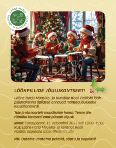 Lääne-Harju Muusika- ja Kunstide Kooli Paldiski löök-pilliosakonna õpilased annavad mõnusa jõulueelse klassikontserdi. Tule ja ela noortele muusikutele kaasa! Teeme ühe rütmika kontserdi enne pühade algust!