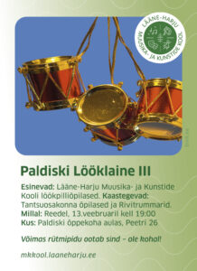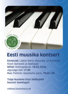 Esinevad: Lääne-Harju Muusika- ja Kunstide Kooli õpilased ja õpetajadMillal: Kolmapäeval, 18.02.2026, algusega kell 17.00Kus: Paldiski õppekoha aulas, Peetri 26 Tulge kuulama Eesti heliloojate kaunist loomingut!