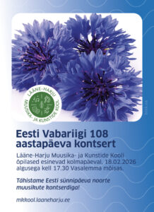 Lääne-Harju Muusika- ja Kunstide Kooli õpilased esinevad kolmapäeval, 18.02.2026 algusega kell 17.30 Vasalemma mõisas. Tähistame Eesti sünnipäeva noorte muusikute kontserdiga!