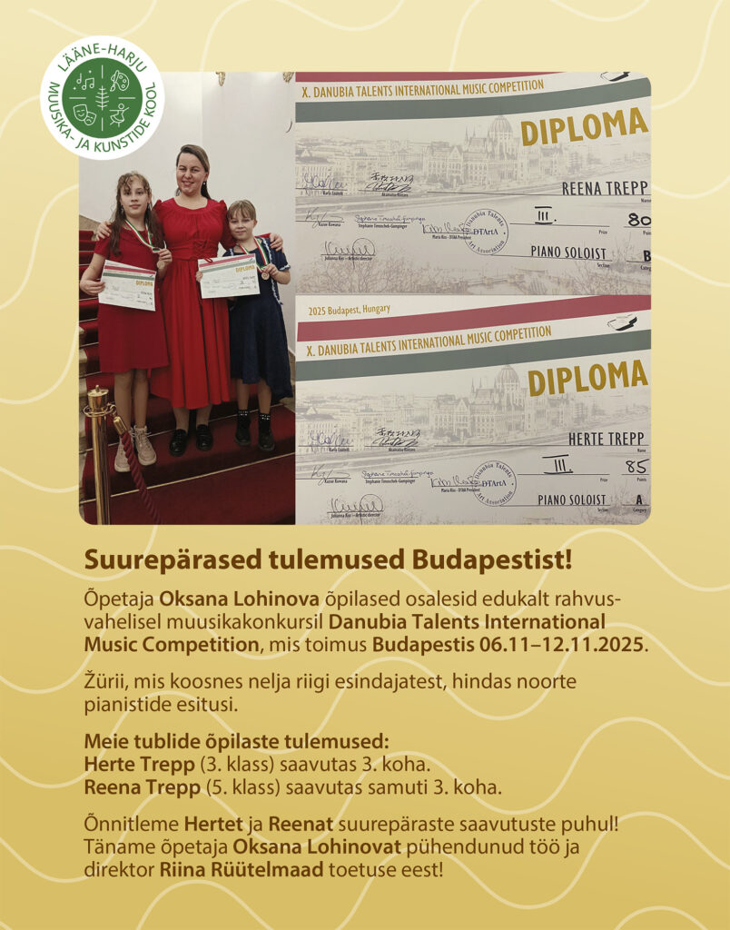 Õpetaja Oksana Lohinova õpilased osalesid edukalt rahvusvahelisel muusikakonkursil Danubia Talents International Music Competition, mis toimus Budapestis 06.11–12.11.2025. Žürii, mis koosnes nelja riigi esindajatest, hindas noorte pianistide esitusi. Meie tublide õpilaste tulemused: Herte Trepp (3. klass) saavutas 3. koha.Reena Trepp (5. klass) saavutas samuti 3. koha. Õnnitleme Hertet ja Reenat suurepäraste saavutuste puhul! Täname õpetaja Oksana […]