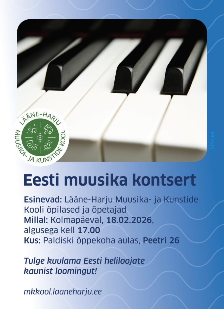 Esinevad: Lääne-Harju Muusika- ja Kunstide Kooli õpilased ja õpetajadMillal: Kolmapäeval, 18.02.2026, algusega kell 17.00Kus: Paldiski õppekoha aulas, Peetri 26 Tulge kuulama Eesti heliloojate kaunist loomingut! mkkool.laaneharju.ee