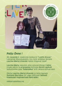 23. novembril, osalesime konkursil “Lustlik Klaver” Lasnamäe Muusikakoolis, kus meie andekas õpilane Laurina Maria Litnevski näitas hiilgavat taset! Laurina Maria saavutas oma vanuserühmas I koha!