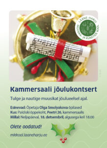 Lääne-Harju Muusika- ja Kunstide Kooli õpilased ja õpetajad ootavad teid kaunile jõulukontserdile.Kontsert toimub Nelipühi kirikus PAKRI 3, PALDISKI. Reedel, 12. detsemberil. Algus kl 18:00. Sissepääs