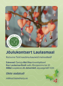 Kutsume Teid nautima kauneid meloodiaid! Esinevad: Õpetaja Mai Otsa klaveriõpilased Kus: Laulasmaa Kooli saalis, Kloogaranna tee 20Millal: Laupäeval, 20.detsembril, algusega kell 14:30 Tule ja saa