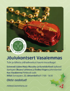 Lääne-Harju Muusika- ja Kunstide Kool kutsub meeleolukale jõulukontserdile! Esinevad Lääne-Harju Muusika- ja Kunstide Kooli õpilased ja õpetajad. Millal: Kolmapäeval, 10. detsembril. Kell 18:00. Kus: Peetri